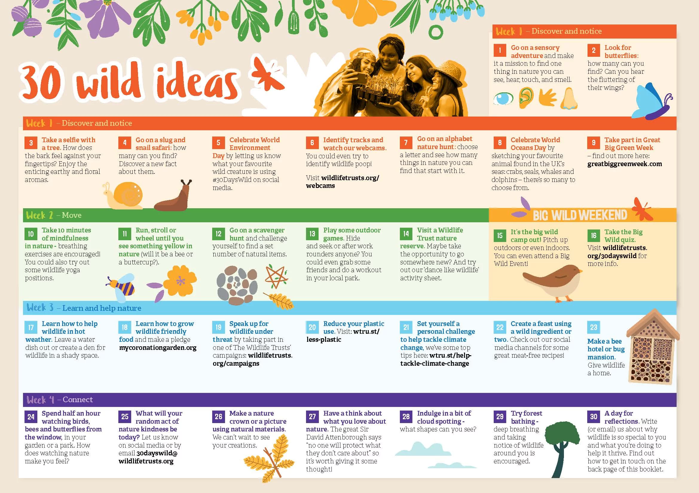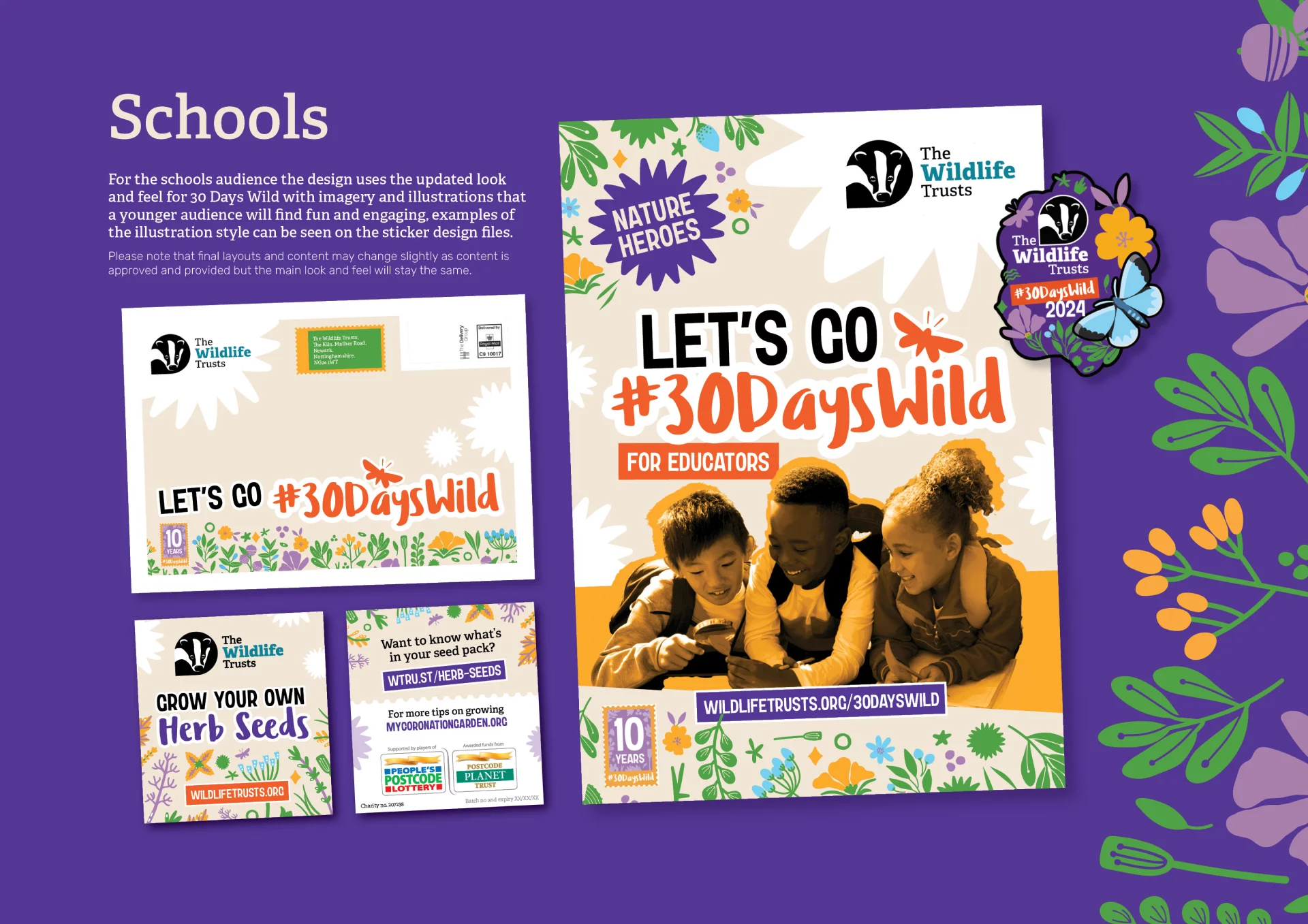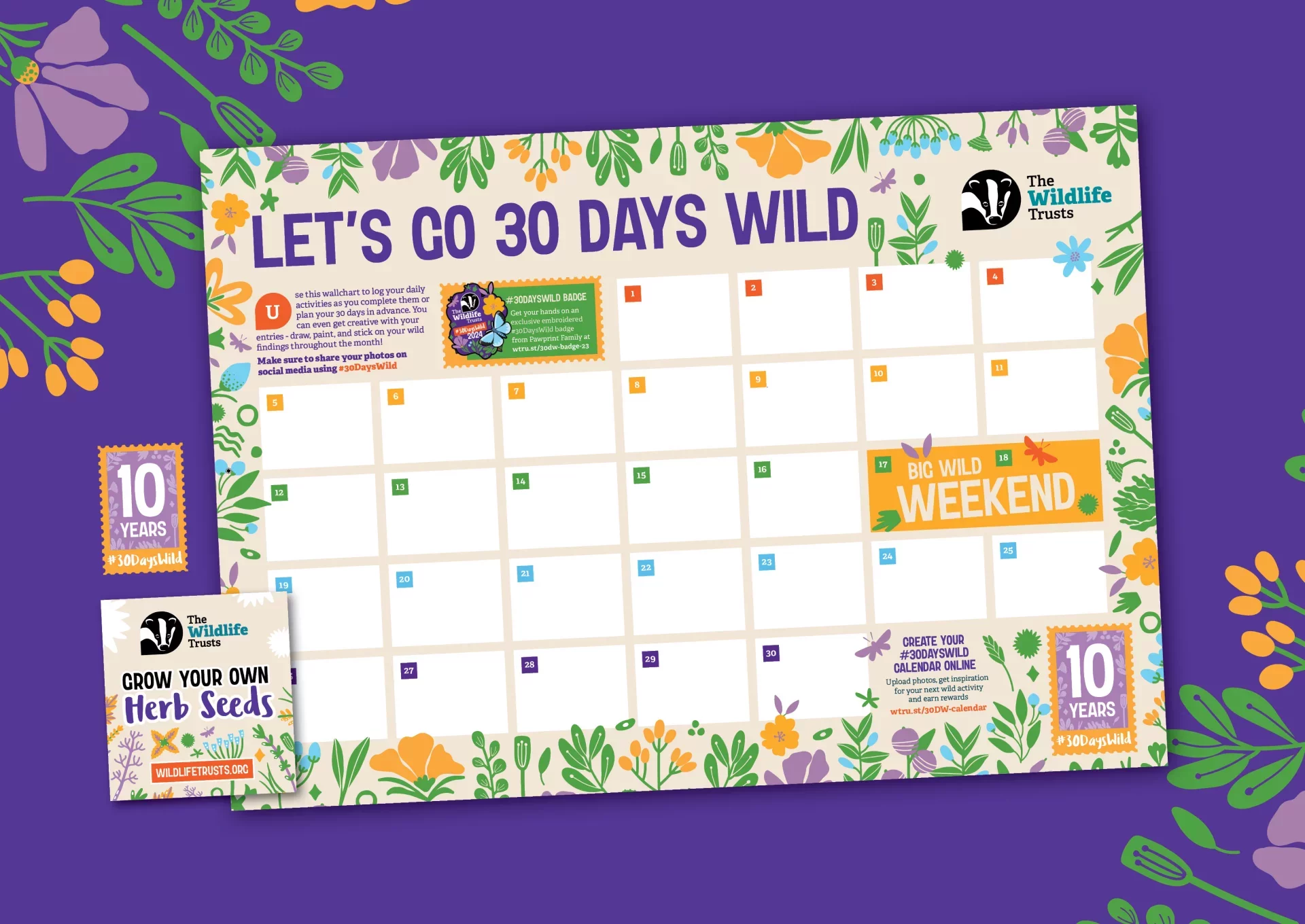 The Wildlife Trust’s 30 Days Wild campaign is a month-long challenge that encourages people to engage with nature every day throughout June. The goal is to inspire small, meaningful actions that help individuals connect with the natural world, whether it’s birdwatching, a woodland walk, or simply enjoying the sounds of nature in the garden. The campaign also promotes creativity, with ideas for nature-inspired art, photography, and cooking. I was tasked with redesigning the look and feel for the the 30 Days Wild Campaign, with a focus on the 10 year anniversary of the campaign and with a brief of making the identity appeal to adults as well as children.