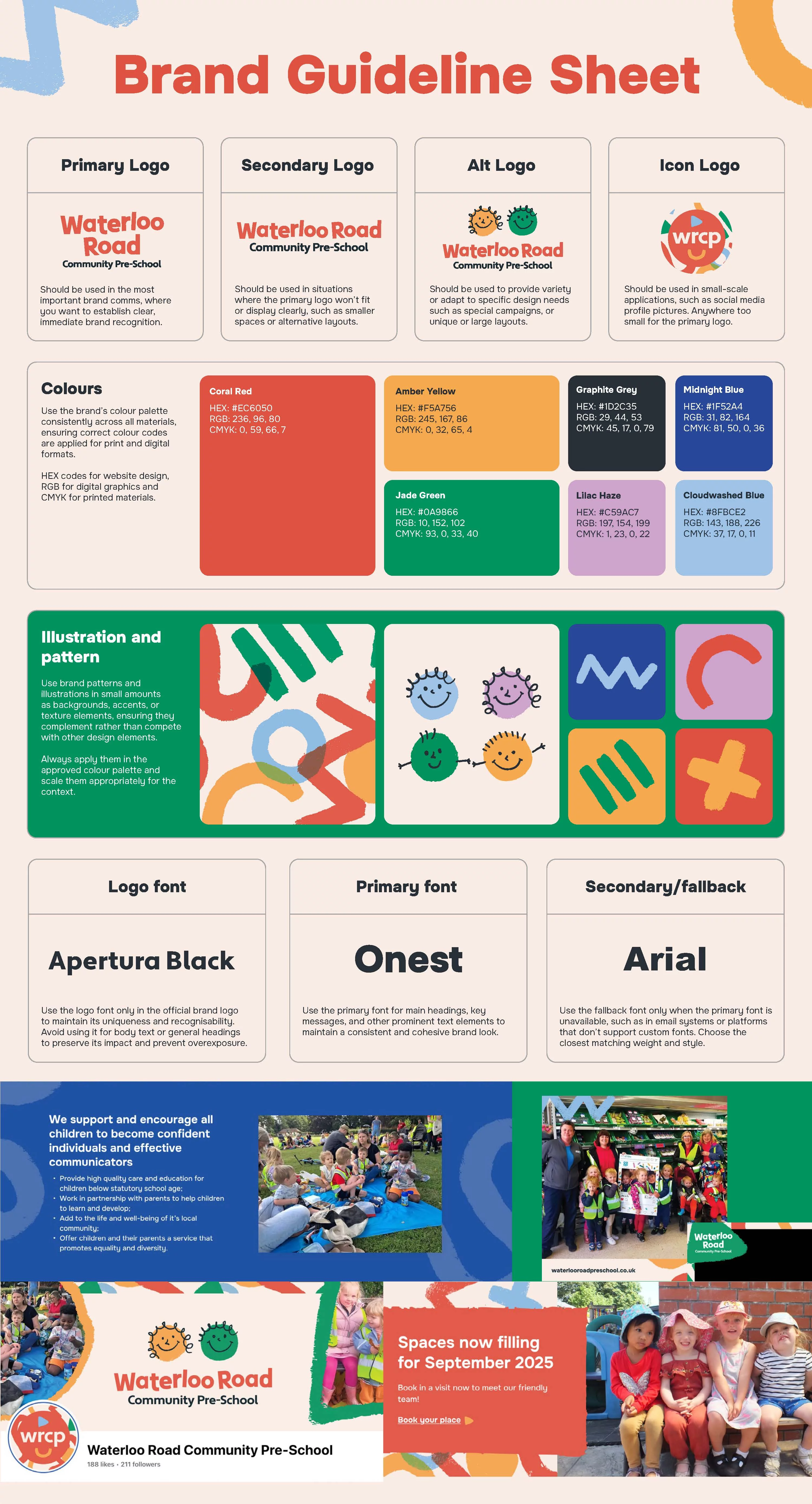 The colour palette is carefully crafted to reflect the vibrant, nurturing, and joyful environment of Waterloo Road Community Pre-School. Each hue is selected to be both visually engaging for children and clearly functional for communication with adults, creating a playful but professional visual identity.
